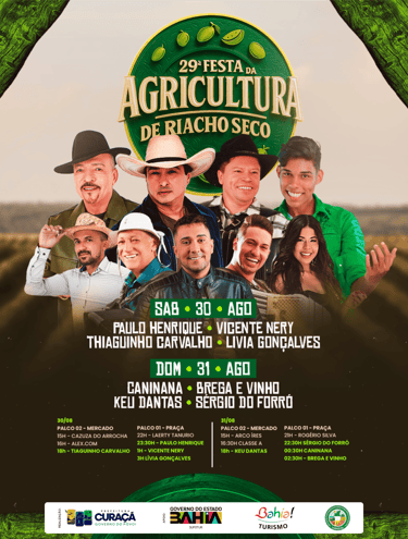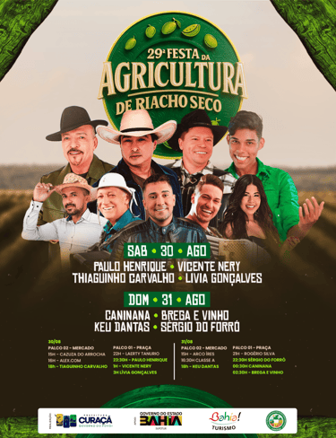 Nos dias 30 e 31 de agosto, o Distrito de Riacho Seco será palco da 29ª edição da tradicional Festa da Agricultura, um dos eventos mais importantes para os produtores e moradores da região. A celebração valoriza o trabalho do homem e da mulher do campo, com programação cultural, apresentações musicais e muito mais.