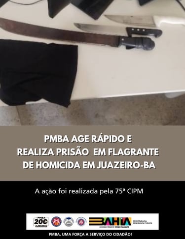 PMBA AGE RÁPIDO E EFETUA PRISÃO EM FLAGRANTE DE SUSPEITO DE HOMICÍDIO EM JUAZEIRO (BA)